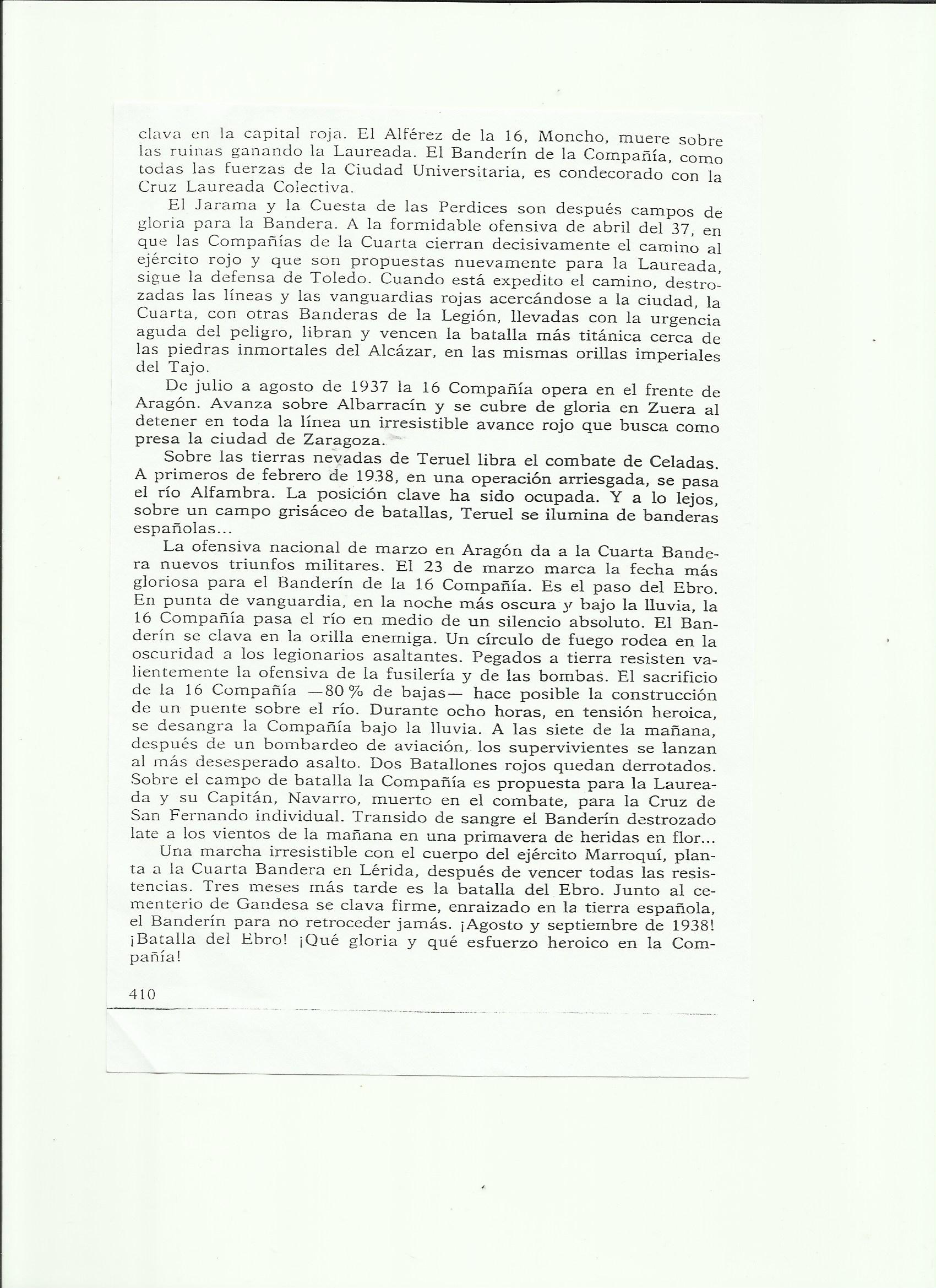 Sin detenerme en las acciones de combate de la Compañía, que pueden leerlas en los anexos, les relataré el destino final de su glorioso Banderín que, aunque contado por Luca de Tena, es desconocido incluso en el ámbito militar; quizá ocultada por esos complejos que nos distinguen.