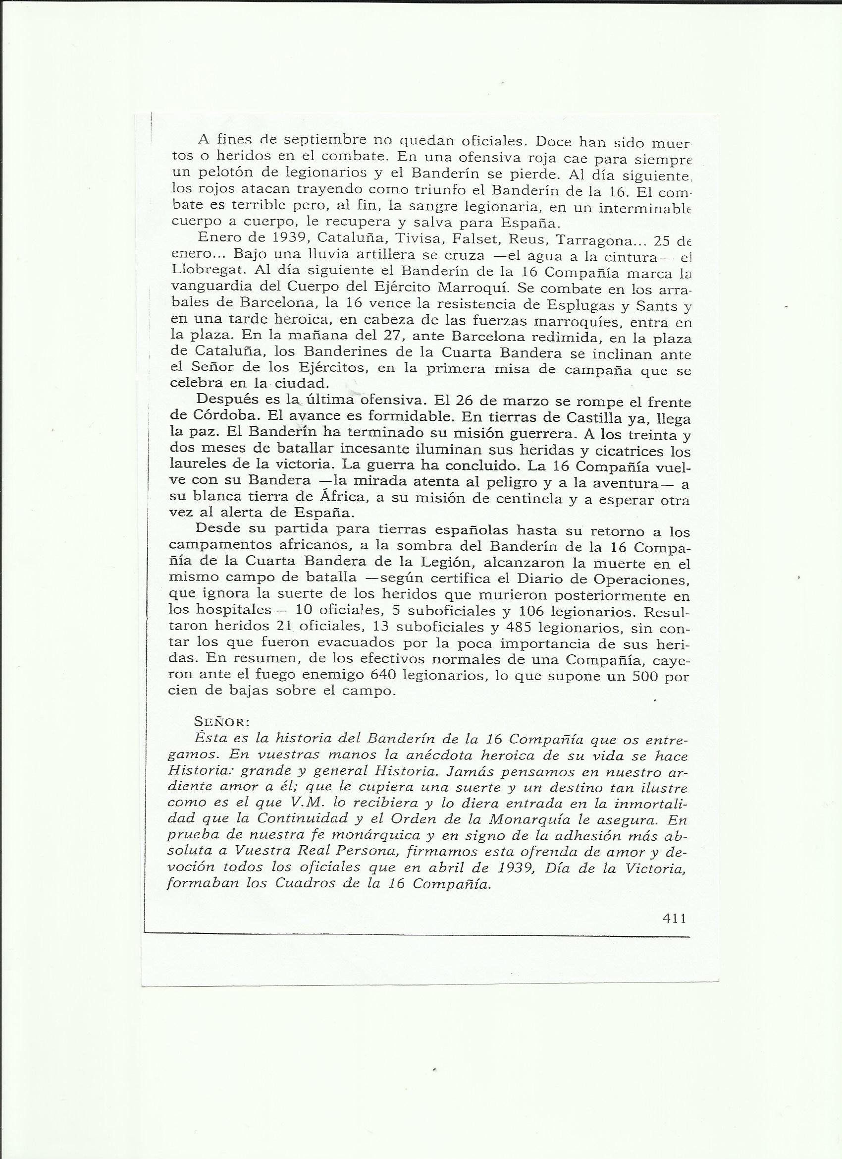 Hoy hablo en voz alta contando la historia del Banderín de la 16 Compañía de la IV Bandera de la Legión. Sus acciones, y esta última de su glorioso Banderín al que dirigieron su vista tantos legionarios antes de morir, quedarán inmortalizadas siempre que difundamos su historia. Aquél desgarrado Banderín, que a pesar del elevado número de bajas jamás mordió el polvo ni cedió en ningún combate, sigue en pié dando ejemplo de valor y heroísmo. El oficial que al terminar la guerra era depositario del mismo era el Teniente González del Yerro, oficial más antiguo de la Compañía, y el más cualificado de los que sobrevivieron , por tener la Medalla Militar Individual. Ha muerto el último de los siete oficiales que entregaron a Don Juan la histórica enseña.
