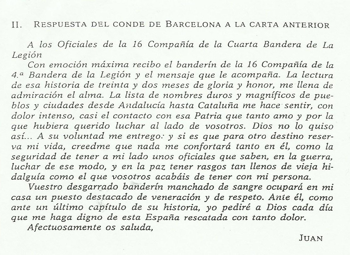 Finalizada la Guerra Civil, los oficiales de la 16 Compañía, Capitán Victoriano Isasi, Teniente Jesús González del Yerro, Tenientes Provisionales Manuel Cortázar, Juan Manuel García Vinuesa, Francisco de Gomis, José Quintana y Antonio Rodríguez Carvajal, envían una carta al Conde de Barcelona remitiéndole como ofrenda el Banderín de la 16 Compañía de la IV Bandera de la Legión. Pensaron estos oficiales que era el más digno destinatario por ser Don Juan “encarnación de la Patria y del Ejército”.
