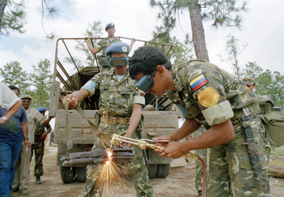 En efecto, aún recuerdo como desde el Estado Mayor nos llamaron a dos comandantes españoles y simplemente nos dijeron: “mañana vais a Comayagua, recogéis los explosivos y los entregáis a otro equipo que se encontrará en la población de Danli”, ya en Nicaragua. Inmediatamente estudiamos el itinerario a recorrer y revisamos nuestro magnifico Toyota “land cruiser” con la única protección como escolta de nuestras boinas azules y el color blanco del vehículo, ambos símbolos identificativos de las NNUU. El caso es que ya listo y preparado para partir recibo por parte de mi compañero la extraña petición de eximirle de acompañarme. La razón alegada, y que hoy recuerdo con una enorme sonrisa, no era otra que la de encontrarse embebido en amores con una guapa hondureña y que le era inevitable el dejar de pasar la ocasión de pasar con ella uno o dos días a modo de asueto. No acabé de entender la excusa pero el caso es que me convenció y por lo tanto emprendí la misión en solitario. Al fin y al cabo era una tarea sencilla y no ví mayor problema en acceder a sus deseos. Ignoro cómo estará hoy la ruta en cuestión pero por aquellos días les aseguro que se trataba de una carretera infernal, asfaltada sólo en parte y llena de baches como hoyos. Cierto es que antes de llegar a zona habíamos recibido en España cursos de conducción todo terreno y habilidades para solucionar pequeñas averías pero aún así uno no las llevaba todas consigo al viajar en solitario por aquellas rutas centroamericanas; pero el caso es que la fortuna me acompañó y llegué sin mayor contratiempo a la cementera de Comayagua. Allí, y ante la cara de asombro de los operarios de la fábrica, introduje los 300 kg de explosivos en el maletero, la cinta explosiva debajo del asiento trasero y los detonadores en la guantera emprendiendo sin más dilación el itinerario de vuelta. Apenas habían transcurrido 20 km cuando tuve el primer incidente al ser interceptado en la susodicha carretera por un grupo de unos 10 hombres uniformados y armados que tan sólo solicitaban que les trasladara a las cercanías de Tegucigalpa.