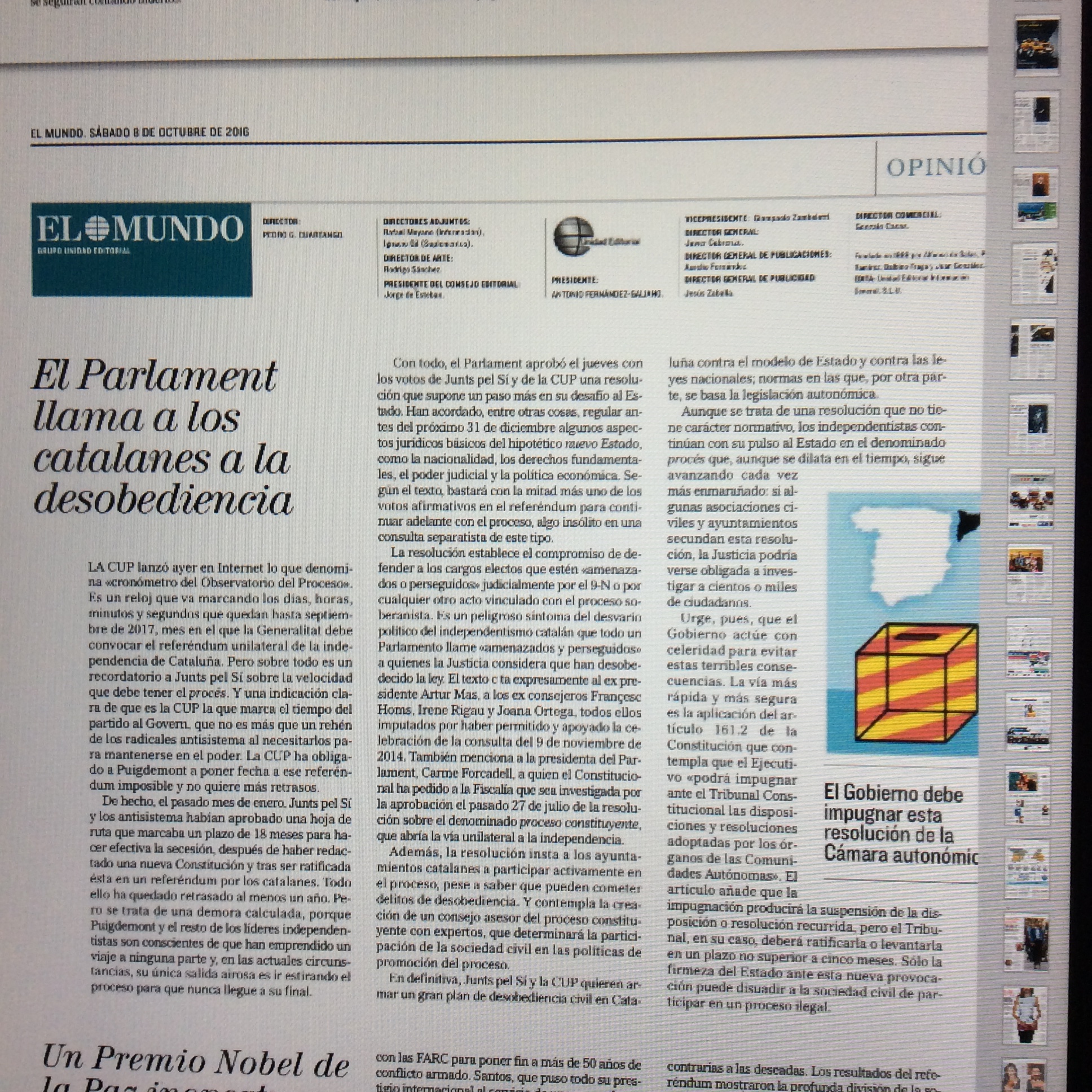 Lo urgente es restablecer en Cataluña el imperio de la ley. Porque en Cataluña hay ya un estado auténticamente revolucionario : se desconoce y viola la vigente Constitución. Y en paralelo, se aprueban leyes autonómicas que son una verdadera nueva Constitución, a medida de Cataluña nada más, y aprobadas sin tener en cuenta la Constitución española. Este estado de revolución debería ser sofocado de forma inmediata. Entre otras cosas, amenaza con extenderse a toda España.Otras regiones podrían animarse a seguir el mal ejemplo de Cataluña. Y Podemos amenaza con una huelga general, si el PP sigue gobernando. ¿No suena esto a las amenazas que dieron lugar a la Revolución de octubre de 1934?