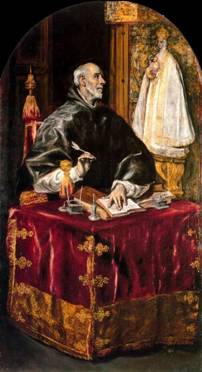 El Greco, ya «toledano» bebería naturalmente de esta vivencia, y también en distintas ocasiones la llevó al lienzo como veremos; en esta obra, en deliciosa anacronía, recrea al santo mientras escribe su tesis en defensa de María virgen.