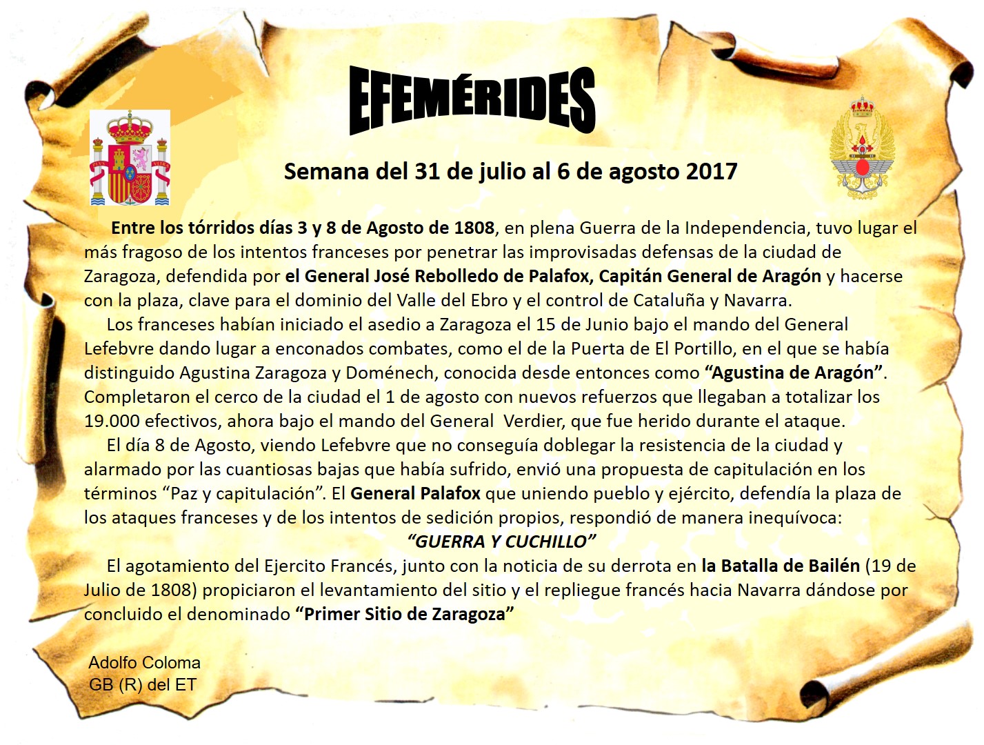 Roto el débil paredón/se abalanzan a la brecha/más no hay quien prenda la mecha/del mortífero cañón/en aquella confusión/corre una mujer, se inclina/y el duro bronce fulmina/sin que la muerte le adombre/que aqui, cuando falta un hombre/siempre sobra una heroína. Y que siempre sea así cuando España esté en peligro.