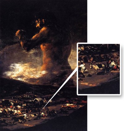 Les pido que por un momento lo recuerden. El Coloso presenta un paisaje en el que una figura masculina de proporciones gigantescas camina de espaldas, rodeada de nubes, con sus ojos cerrados y el puño izquierdo levantado. En la parte baja, en tamaño muy reducido, hombres y mujeres, carruajes y animales, corren en enloquecida huida ante la presencia del gigante. El cuadro transmite: pánico.