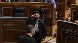 Rufián saluda al banco azul mientras abandona el Congreso tras un rifirrafe con el ministro Zoido en la sesión de control.