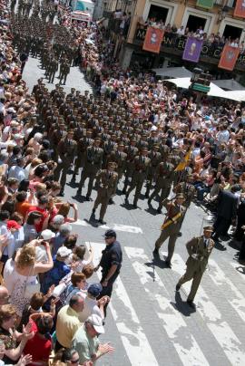 La inigualable estampa de más abajo no sería hoy posible; sí cuando lo escribí. El Ministerio de Defensa del Gobierno socialista (2010) redactó un nuevo Reglamento de Actos y Honores Militares, y desde entonces la Compañía de Honores con Bandera, Escuadra de Gastadores, Banda y Música no rinde honores a la Custodia de Arfe.