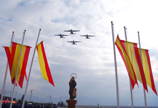 3. Como miembro de la Agrupación de Veteranos de la Base Aérea de Torrejón, tuve el honor de participar en los actos conmemorativos dedicados a Nuestra Patrona, Nuestra Señora de Loreto. Cuanta emoción ante los Himnos Nacionales y del Ejercito del Aire, y no digamos en la ofrenda a los Caídos en acto de servicio, con salvas y pasada de los F18. Pude comprobar, que como a mi, fueron muchos a los que se les saltaron las lagrimas. ¿Como puede haber españoles insensibles a lo que está ocurriendo en nuestra Patria?¡ Arriba España !. Julio de Felipe
