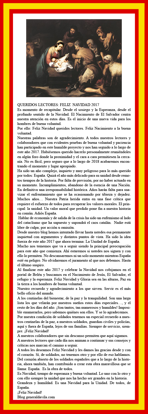 Feliz Navidad a todos los componentes de ese blog tan necesario para mantener vivo el espíritu de amor a España y enterarnos de muchas cosas que nadie cuenta. Gracias mis generales, coroneles y colaboradores. Juan sin Miedo