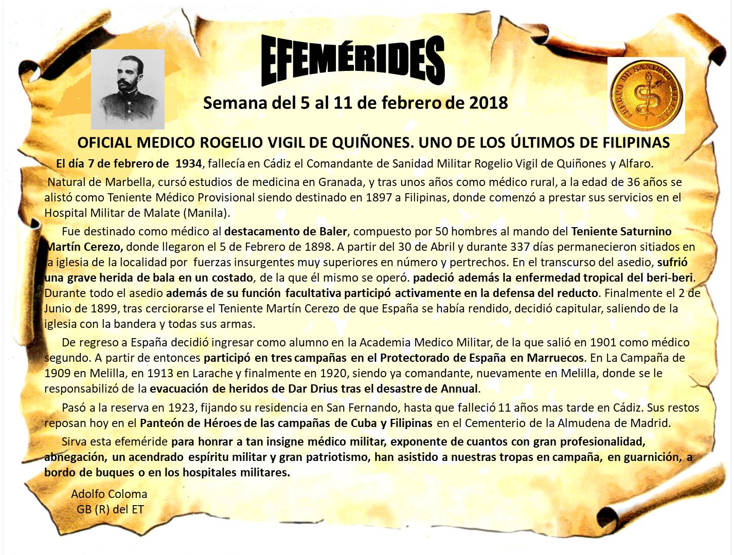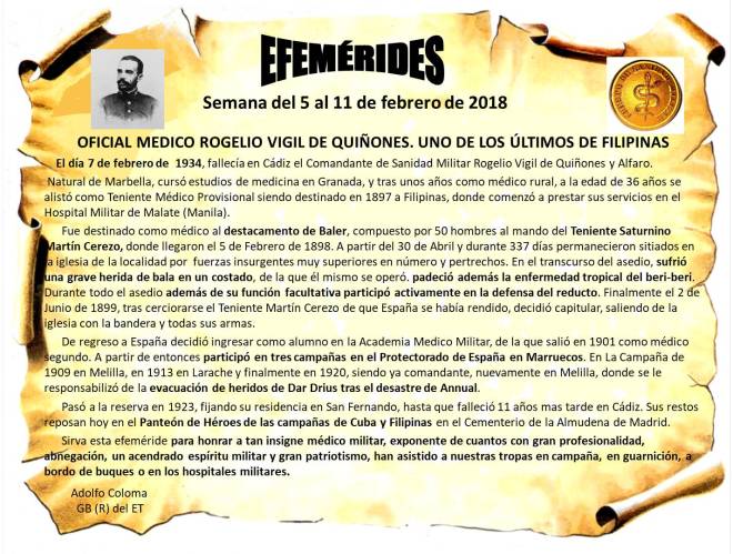 Muy merecido recuerdo y homenaje a uno de los últimos héroes que resistieron, negándose sistemáticamente a rendirse, de Filipinas, el entonces Teniente Vigil de Quiñones. Y merecido homenaje también a la Sanidad Militar de la época, cuando los Oficiales Médicos, siempre de guerra en guerra y sin medios materiales ni apenas fármacos, más que curar, tenían que hacer auténticos milagros, y de eso él fue un gran ejemplo de inventiva durante el sitio de Baler encerrados en aquella pequeña iglesia.