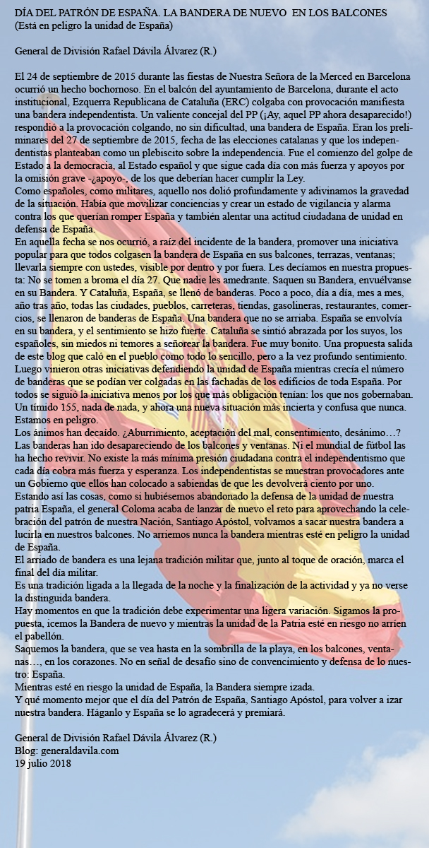 Conoces mi casa, mi General. Desde la primera iniciativa tengo colgadas cuatro Banderas: dos dan a la rotonda, una a la travesía y otra la «patio de chinas». Ahí siguen; cuando se deterioren las cambiaré por otras, mientras, como dices, esté en riesgo la unidad de España.