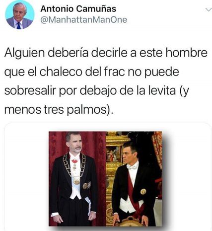 Pero conozco gente que cuando no sabe usar los cubiertos para pescado espera antes de empezar a comer para ver cómo lo hacen las personas a su alrededor. ¿Es que éste señor (por llamarle de una manera correcta) no ha visto nunca una fotografía del Rey con Frac?