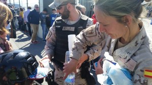 Ejemplar la acción de los infantes de Marina repartiendo agua entre los visitantes.