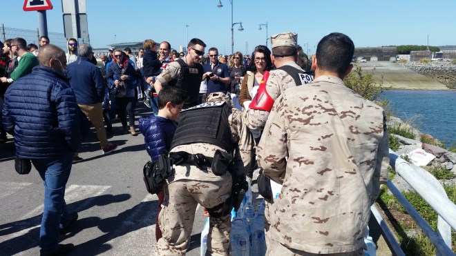 5.- La más llamativa que desató entre el público que esperaba poder acceder al barco admiración, simpatía, respeto, cariño, emoción y un sonoro aplauso, fue el detalle de un grupo de infantes de Marina que repartieron agua entre la gente, preocupándose principalmente de los niños; embarazadas y personas mayores.