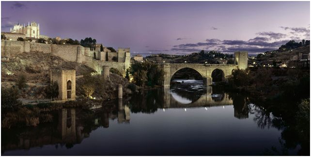 Pasan aquellas bajo los arcos de este puente que sustituyó a uno de barcas del que se conserva en no mal estado uno de los estribos junto a una pequeña torre adelantada sobre el cauce;  se la conoce como “el baño de la Cava” vinculada a la leyenda-realidad de reyes rijosillos y niñas bien que se bañaban en el incomparable paraje: un padre en busca del honor de la familia, una negativa real, y…  Sobre esto también volveremos, seguro. Desaparecido el de barcas se comenzó a primeros del S. XIII la construcción en piedra de éste que, natural en Toledo, también cuenta con su propia leyenda; la de la mujer del maestro constructor, que enterada por confidencias de alcoba de su preocupación por las posibles deficiencias del gran arco central prendió fuego a las cimbras de madera que todavía lo sustentaban; el arco cayó al agua, y de forma tan expeditiva la buena señora salvó el nombre de su marido, que tuvo que rehacerlo mejorando, naturalmente, los cálculos.