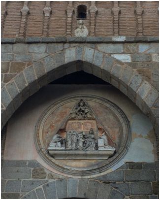 El mismo medallón incorpora la representación tan toledana de la imposición por María a San Ildefonso, campeón en le defensa de su virginidad sobre lo que, seguro, volveremos a hablar. Hay también una aportación curiosa que puede verse entre la obra de ladrillo sobre los arcos de entrada; un pequeño busto, resto de un sarcófago paleocristiano.