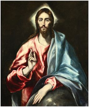 Y porque lo tenemos al lado, traemos al que ocupa la sala principal de su museo en la ciudad, la que fuera su “mejor patria”. Viene como ilustración al he aquí al hombre de Pilatos: de todos sus “Cristos” quizás sea en éste donde de forma más patente plasmó la humanidad de Jesús al que “cual Dios y hombre, de tonos revestido”, como en el segundo motivo de hoy, nos lo representa en una manifestación palpable de la importancia del simbolismo de los colores en el arte bizantino; obsesión por el color que EL Greco no abandonaría nunca en su paleta.