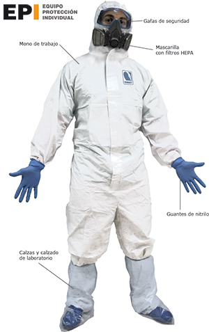 3º) Equipo de Protección Individual (EPI): Un combatiente o un grupo ha de luchar protegido, y volviendo a recopilar recomendaciones, se deben usar mascarilla y guantes, siendo recomendable según la actividad usar gafas y vestuario de protección. Este material hay que manejarlo adecuadamente para colocarlo y retirarlo, evitando contacto con posibles partes contaminadas. El vestuario, gorros, batas, zapatos, etc., también requieren limpieza, las manos o guantes requieren frecuente lavado con jabón y no tocarnos boca, nariz u ojos. Este material se asemeja al EPI de un combatiente, o al de un obrero en su trabajo frente a sus riesgos laborales. Es una responsabilidad individual manejarlo correctamente, por la propia seguridad y la de los demás. Es un material individual, intransferible y habrá que seguir usándolo mucho tiempo.