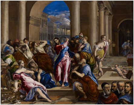 Julio Clovio, de origen dálmata establecido en Roma, es considerado el mejor miniaturista e ilustrador de libros iluminados del siglo XVI y, seguramente, el último gran maestro de dicho género de origen medieval. De todas formas, su fama actual se debe en gran medida a su amistad con nuestro protagonista a quien ayudó en sus años juveniles en Italia presentándolo al Cardenal Farnesio, recordamos, como “un joven «joven pintor venido de Venecia, discípulo de Tiziano…» El Cardenal lo acoge en su palacio (hecho fundamental para el desarrollo posterior de su vida y de su obra), y agradecido, se nota, le hizo este retrato, prácticamente simultáneo con otro en compañía de Tiziano, Miguel Ángel y Rafael en la Expulsión de los mercaderes, en el ángulo inferior derecha.