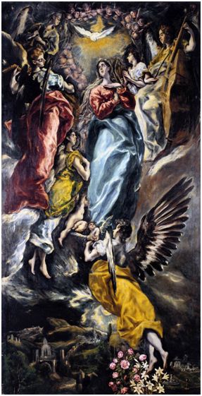 Como tantas veces EL Greco tuvo dificultades para cobrar esta obra; de hecho no lo hizo porque murió antes. Bien es verdad que para realizarla se tomó su tiempo incumpliendo el contrato acordado con el ayuntamiento de Toledo, su cliente en esta ocasión. Es claro que no destacó en cuanto a sus relaciones institucionales. Y cómo no; también hay polémica en cuanto a la denominación del motivo, para unos Asunción, para otros Inmaculada. Para mí el asunto está claro, arrimando el ascua a mi sardina.