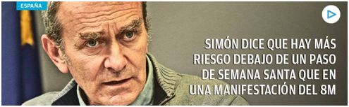 3.- EL DIRECTOR DEL CENTRO DE COORDINACIÓN DE ALERTAS Y EMERGENCIAS SANITARIAS, FERNANDO SIMÓN, HA ASEGURADO ESTE JUEVES QUE EL RIESGO QUE HAY EN UNA MANIFESTACIÓN DEL 8M CON 500 PERSONAS, COMO LAS QUE SE PLANTEAN EN MADRID, ES MENOR QUE EL QUE PUEDE EXISTIR ENTRE LOS COSTALEROS QUE PORTAN UN PASO DE SEMANA SANTA.
