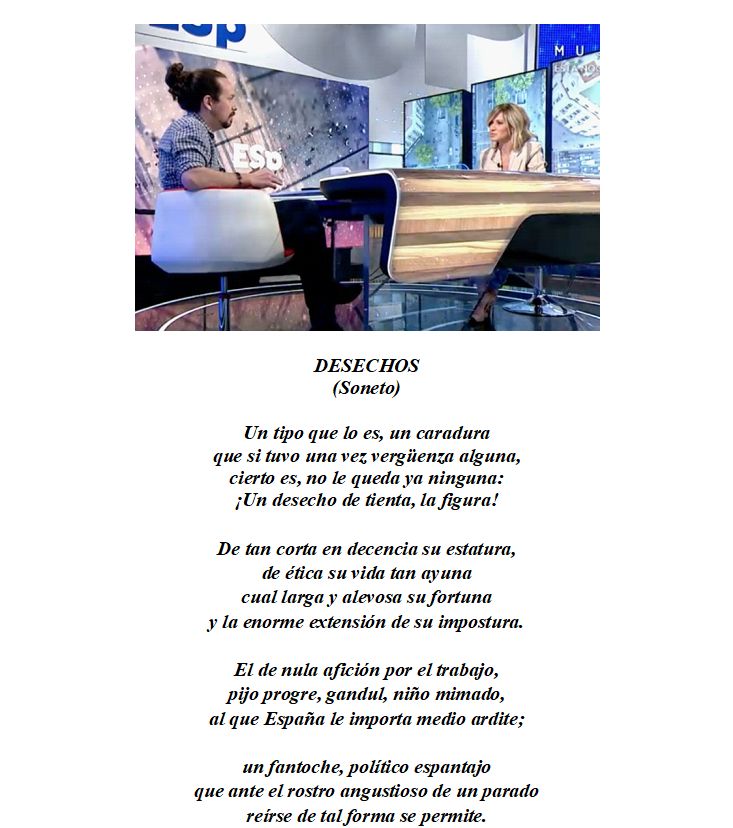 Claro que con “el paro” que le queda -“si otros lo cobraron, por qué no habría de hacerlo yo “– es comprensible que piense (¿?) que eso de trabajar quede para los cretinos. ¿O es que aquello de meterse “casi 6000 € al mes por la patilla, ya no es “indigno”? ¡Qué, poca, vergüenza!; en fin, al soneto.