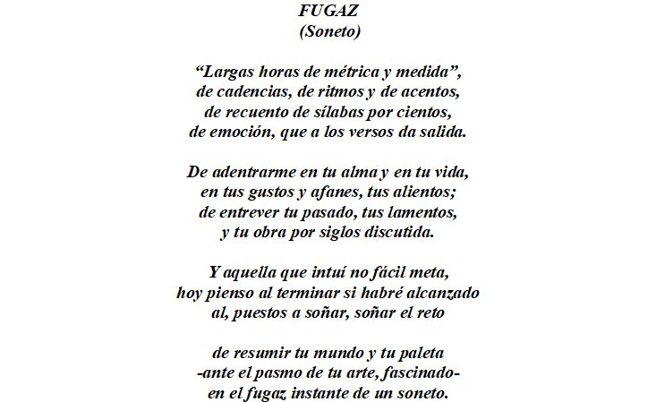 Tengo todos sus sonetos bien guardados, en un pen drive especial, por si acaso mi ordenador me juega una mala pasada, los sarcásticos y los artísticos, y cuando los repaso no se escoger uno especial, me gustan todos.