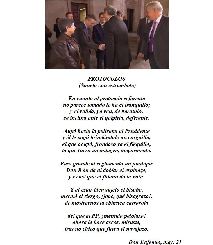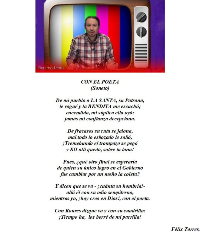 Esto me ha permitido el ir conformando las “crónicas no autorizadas” de cada una de la legislaturas que han regido nuestra vida desde entonces; el formato y “línea editorial” de mis escritos ya son conocidos por los lectores de mi agenda, en principio, y de este blog después. Los títulos que me he permitido asignar a mis trabajos creo que expresan con claridad mis intenciones; con EL TALANTE EN VERSO, LAS HUESTES DE DON RODRÍGUEZ, y SALIMOS DE PONCIO Y…, no sé si salieron bien parados, unos mejor que otros, Zapatero y Rajoy. “EL PRUSÉS” y DE PODEMOS A ¿PUDIMOS? son, igualmente, dos trabajos monográficos cuyos títulos entiendo que se explican suficientemente.