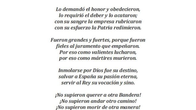 Y con la letra del poema original les transcribo asimismo el poema tal como lo acabo de oír en el Acto de Homenaje a los Caídos desarrollado en la madrileña Plaza de la Lealtad con asistencia de SSMM y la ausencia, ya instituida, del señor Presidente del Gobierno. Juzguen ustedes.