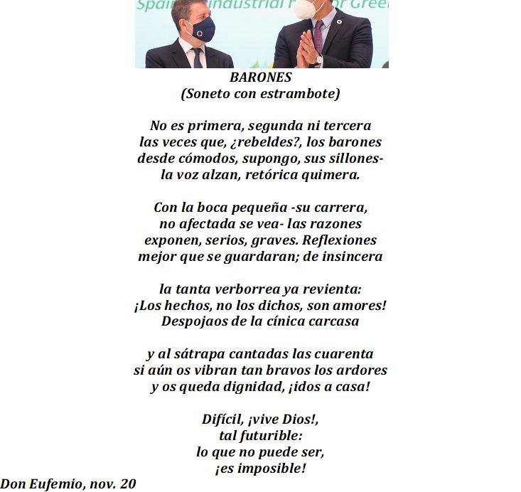 Pero vayamos a su estrambote; profético en cuando a la conducta del c-manchego: ¿O no? Escribe el alcalaíno, retratando a un “valentón”: