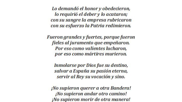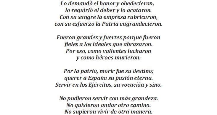 Y con la letra del poema original les transcribo asimismo el poema tal como lo acabo de oír en el Acto de Homenaje a los Caídos desarrollado en la madrileña Plaza de la Lealtad con asistencia de SSMM y la ausencia, ya instituida, del señor Presidente del Gobierno. Juzguen ustedes.