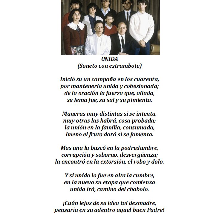 Lástima que otros, para conseguir dicha unión o a través de ella hayan seguido derroteros tan distintos. Esperemos que la Justicia ponga donde se merece a todos y cada uno de los miembros de esa familia con su currículum vivencial harto conocido de listillos, chantajistas, aprovechados y trincones donde se merecen; junto, naturalmente, con los colaboradores necesarios.
