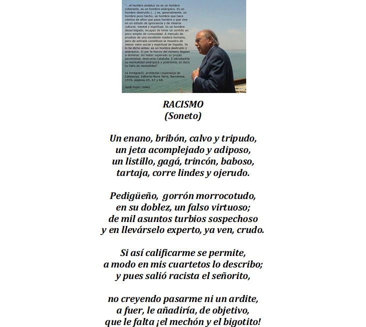 “…el hombre andaluz no es un hombre coherente, es un hombre anárquico. Es un hombre destruido (…) es, generalmente, un hombre poco hecho, un hombre que hace cientos de años que pasa hambre y vive en un estado de ignorancia y de miseria cultural, mental y espiritual. Es un hombre desarraigado, incapaz de tener un sentido poco amplio de comunidad. A menudo da pruebas de una excelente madera humana, pero de entrada constituye la muestra de menor valor social y espiritual de España. Ya lo he dicho antes: es un hombre destruido y anárquico. Si por la fuerza del número llegase a dominar, sin haber superado su propia perplejidad, destruiría Cataluña. E introduciría su mentalidad anárquica y pobrísima, es decir, su falta de mentalidad. “