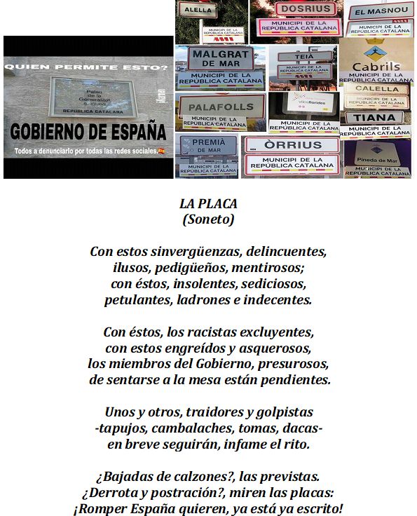 El hecho de que sea un montaje, una noticia falsa la primera fotografía de más abajo no quita ni una pizca de razón del argumento para el impetuoso, exaltado, sombrío, apesadumbrado y espero no profético soneto con el que hoy les hago partícipes del poco boyante mi estado de ánimo. Porque si la placa del Palacio de la Generalidad es un fake, no lo son los carteles en colocados en cientos de pueblos de las provincias catalanas, según se aprecia en la composición, sólo una ligera muestra, adosada a la misma.