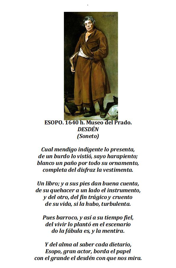 Salvo la inscripción que acompaña la figura, nada haría pensar ante este digno mendigo callejero pintado con tan jugoso realismo popular que se trataba del fabulista griego. El lienzo, como su compañero Menipo, (filósofo que nació esclavo y se afilió a la secta de los cínicos) pintado con parecida traza, fue realizado para la Torre de la Parada, palacete de caza y recreo en el bosque del Pardo, entre 1639-1640.