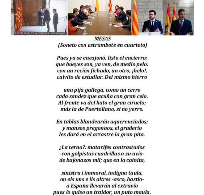 Justo acabo de leer en el móvil una información -seguramente un bulo- sobre la posible transformación de la Monumental de Barcelona en una mezquita cuando en los digitales empiezan a salir las noticias de la inminente puesta en escena de la “taula de negociació”, “mesa de la negociación” para ABC y MESA DE LA INDIGNIDAD para todo español de bien. Una “mesa inter pares” entre los gobiernos de España y de la comunidad catalana en la que se pondrán sobre la misma “negociaciones bilaterales” sobre referendums, independencias, aeropuertos, asimétricas financiaciones , confederación de nacioncitas o vaya usted a saber; aberración con la que se pretende lanzar una cortina de humo que tape cualquiera de las otras barbaridades perpetradas por el primero de ellos, como lo de Marlaska, lo del famoso trasero o lo de darle pellizquitos de monja al recibo de la luz, por citar unas cualquiera.