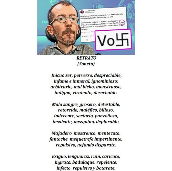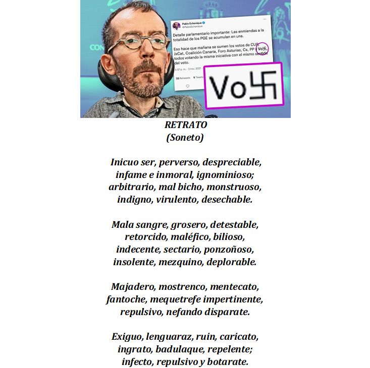 Que Echenique ponga la esvástica en el nombre de VOX demuestra lo torpe y tonto que es, ya que si no tuviera la enfermedad que asola su cuerpo, no merecería la pena nada de lo que dijera ni repararíamos. ¿Sabrá lo que quiere decir «vox populi»? Me temo que no. Todavía no le oído a Abascal ninguna orden de envío al gaucho éste que vino a darnos lecciones (que luego no se aplica) a ningún campo de concentración como los que ellos tienen en su añorada Cuba (a la que no van para quedarse, qué pena, y no volver) Oyes al hijo de la Argentina éste y por poner un ejemplo a Juan Luis Steegman, y notas que alguna diferencia hay, de lo que es rigor y formación frente a imprecisión y demagogia. Lo del Pollo es un «pollo» que no lo mejorarían ni el más grande de los sainetes que hubieran podido crear los hermanos Álvarez Quintero. Y mientras haciendo amigos con los norteamericanos (si al menos sirviera para desenmascarar todavía más a los secuaces de Echenique y sus trapisondas en Venezuela….)