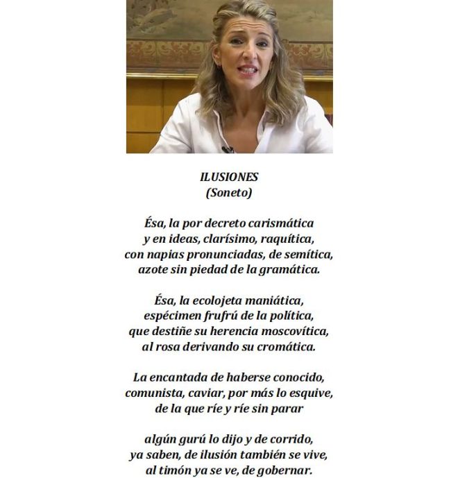 El primer tema : «YOLANDA DIAZ Y SUS PRETENSIONES», claro que se lo ha creído y con su CLIMATICA DEMOCRACIA y LA REIVINDICACIÖN TRANSVERSAL se hace las ILUSIONES también reflejadas en su genial soneto.