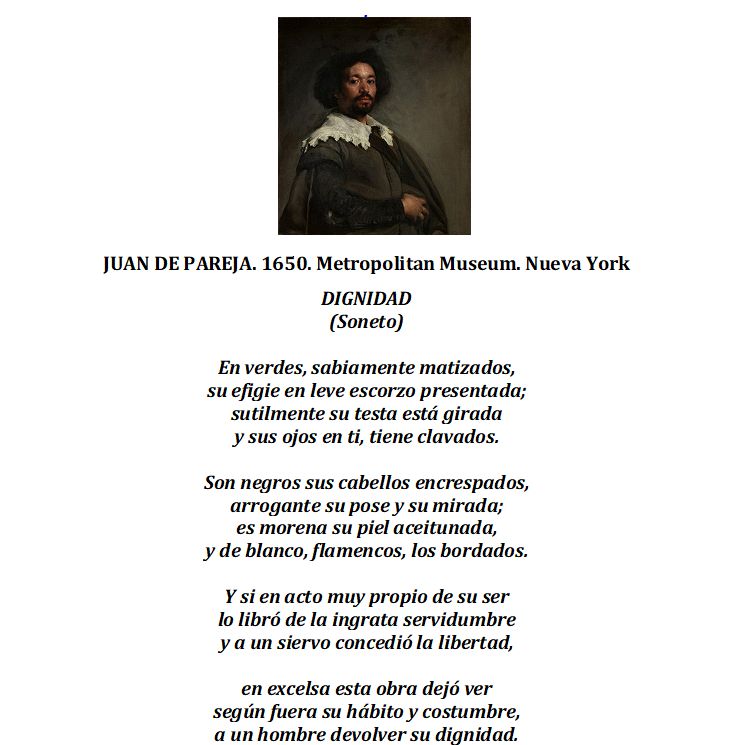 Y ese Juan de Pareja también es acreedor, como el que más de los mortales, a tan alto honor y distinción, pues encarna, con toda dignidad, a quien comenzó sirviendo en calidad de esclavo y su dueño convirtió en alumno y lo trató de igual a igual, y cuando juzgó que podía ganarse la vida de forma libre e independiente, le otorgó carta de libertad. Que teniendo en cuenta la cultura y las costumbres de la época en lo que a la relación laboral se refiere, debió ser algo grandioso y extraordinario.