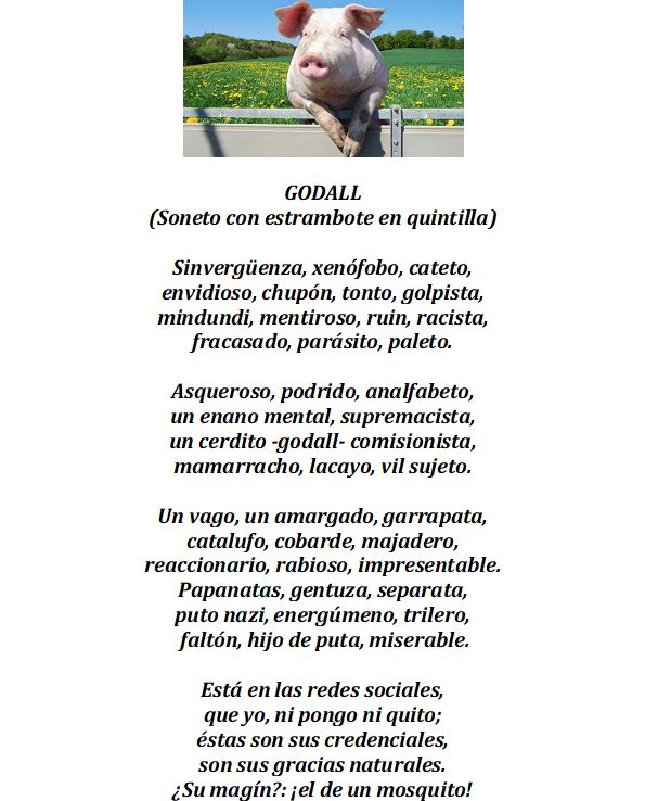 Y uno, de natural vaguete y pensando que el trabajo le podría venir hecho se fue a los digitales en busca de la noticia y, principalmente, de los comentarios de los lectores: por miles se han podido contar, en los que éstos se despachan a gusto a base de otros tantos miles de calificativos “adjudicables” al mentecato en cuestión. Aunque había para más -con uno le basta; más no se merece- me he quedado con algunos de los amables epítetos que adornan la primera docena de los citados comentarios y los he tratado de ordenar para componer el soneto que leerán más abajo