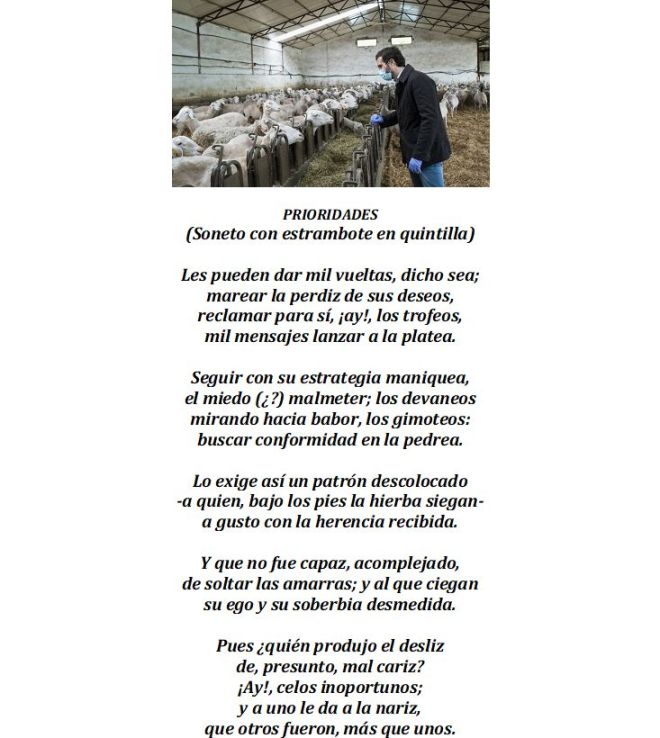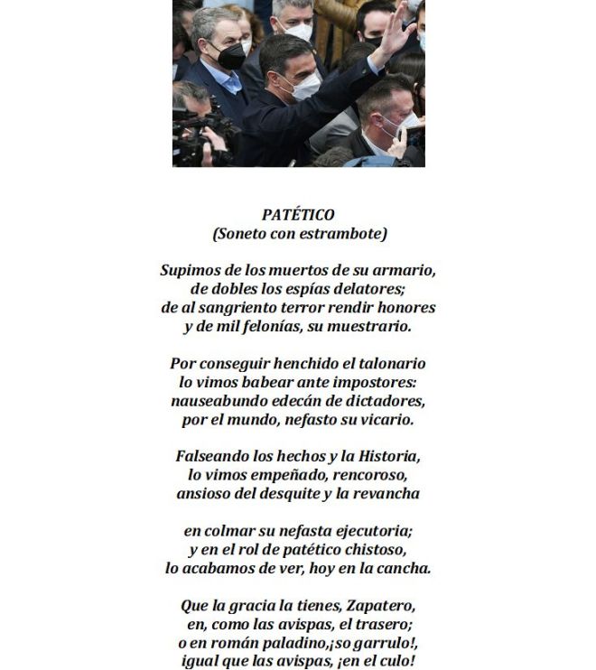 Buenos días Mi Coronel. Después de la desafortunada «conferencia» de Zapatero, las tonterías del, PSOE, y las negaciones de Pablo Casado con respecto a Vox, ya no se que decir, No se si quieren sentarse todos en sus poltronas , pues mirar por el pueblo, me parece que no les interesa a nadie. Estoy completamente defraudada, con estas idas y venidas de todos los «políticos», llaman extrema derecha a Vox, y a los comunistas con Bildu y secesionistas no les llaman extrema izquierda. Menos mal que nos alegra Vd, con sus sonetos. Muchas gracias y saludos para todos