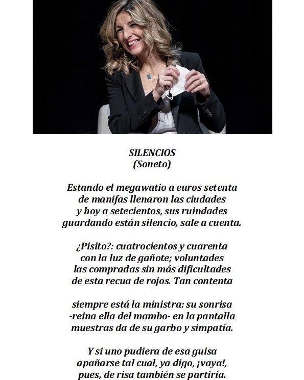 Lo de esa señora, o lo que sea, no es ni siquiera una sonrisa falsa y forzada para la galería, sino una vulgar mueca sardónica, dedicada a todos los que, ya casi, y sin casi, medios de subsistencia ni para comer tres veces al día, tienen que vivir a salto de mata para pagar facturas astronómicas para poder seguir alumbrándose con una bombilla. Porque lo de estufas, placas de cocina o radiadores eléctricos para guisar y calentarse, ya es inasumible. Y si se recurre al butano, sea para cocinar o o para calentarse, peor todavía con una bombona que en menos de dos meses ha duplicado su precio. Y esta tarde me ha sorprendido ver los combustibles para los vehículos rondando los dos Euros el litro, e incluso alguno sobrepasándolos.