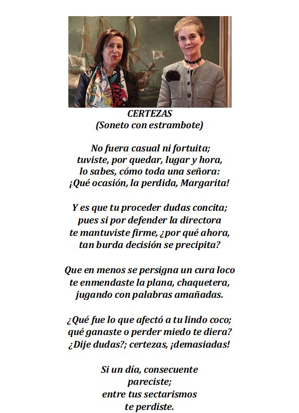 Mi General : Félix da en la diana, tiene toda la razón “ Pobre ESPAÑA 🇪🇸. Esto no va bien, la Margarita que citas, no la entiendo, bueno la entiendo muy bien. El cargo es el cargo y hay que conservarlo. Lo del CNI, penoso. Una mujer ejemplar es destituida. No lo entiendo, algo va mal y a nadie le importa. 🇪🇸🇪🇸🇪🇸