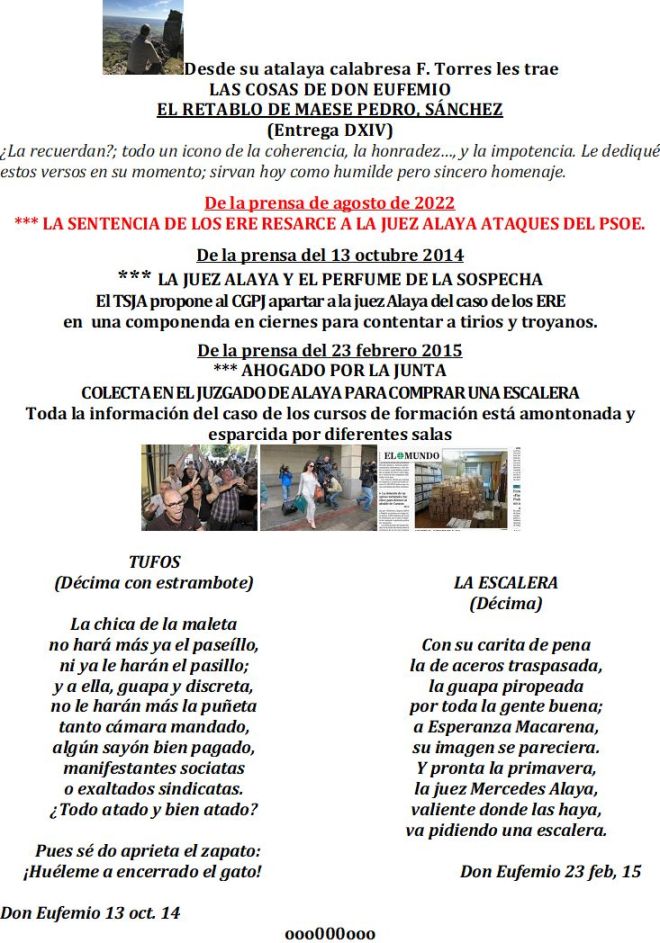 Como hombre de palabra, hoy nos trae los sonetos que en su momento compuso para la Juez Alaya, y escribo Juez con mayúscula intencionadamente, porque ella y algunos más todavía lo merecen. El segundo me trae reminiscencias de un famoso poema, porque eso de pedir una escalera puede también referirse al pueblo que la pedía para quitarle los clavos a Jesús el Nazareno, y a ésta mujer de alguna manera también la crucificaron los que siempre lo hacen con los justos, para callarlos. Puede que la consiguiera para llegar a esos archivos tan abundantes que rozaban el techo, pero no le habría venido mal tampoco para que alguien se subiera a ella y le quitara los clavos, que bien crucificada estuvo sólo por intentar hacer justicia honradamente, cumplir con su obligación, vaya, que la gente es tan olvidadiza que no recuerda muchas veces que para eso están los jueces. La recuerdo bien, D. Eufemio, en esos paseíllos que reflejaban en la prensa, seria, digna, arrastrando su maleta de documentos, que bien sabía ella y sospechábamos todos que podían desaparecer si se quedaban en el juzgado. No se si a éstas alturas se siente reivindicada, espero que aunque puede que no del todo, al menos si lo suficiente como para que sepa que muchos la admirábamos, y la seguimos recordando después de los años como la figura que nos representaba.