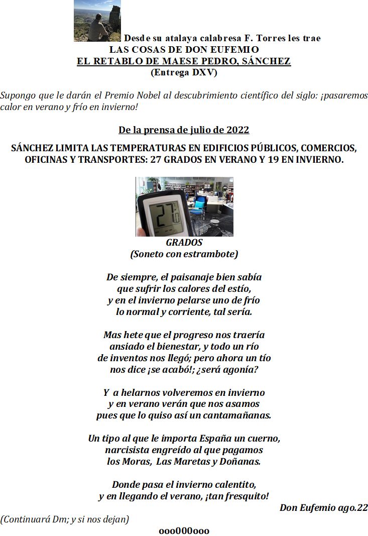 Y se siente muy satisfecho de limitar a 27 grados la temperatura de los pobres funcionarios públicos, incluidos aquellos que trabajen en los hospitales con una bata encima de su ropa (por supuesto sin corbata), con una mascarilla y un gorro, para aliviar los sudores. En un hospital me gustaría verlo a él en esas condiciones, o simplemente en una habitación con dos o tres enfermos más que no podrían dormir y le impediría a él también conciliar el sueño, una vez superado el trauma de tener que pactar con gentuza de todas las calañas.