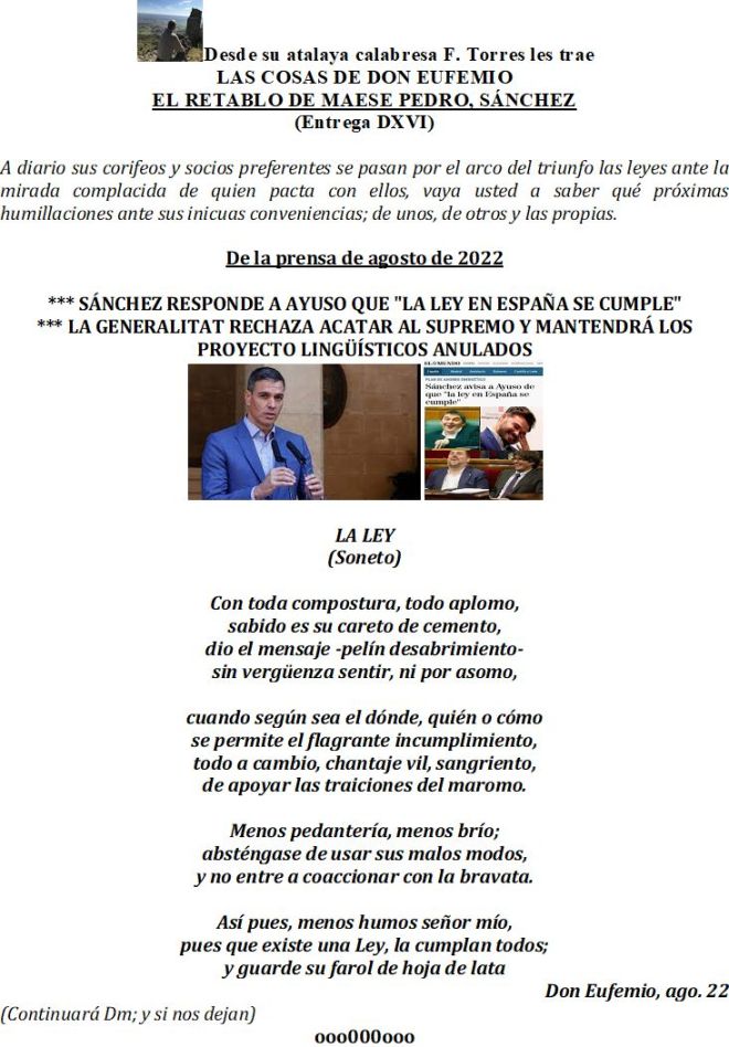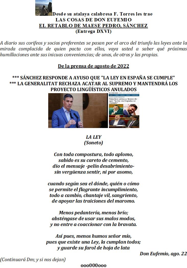 D. Eufemio, tenga usted preparada la pluma y el tintero que las tribulaciones de Rinconete y Cortadillo no son nada con las venideras acciones de Maese Pinocho, que según parece quiere dejar huella en la sociedad española y que en el futuro sus compis de partido, sindicato e independentismo produzcan series para Netflix y otras cadenas de Roures sobre sus andanzas, vida y obra. Ayy señores Quijote y Sancho, sus andanzas caballerescas se están quedando en el olvido, este Pinocho dará mas juego para el futuro que sus andanzas por nuestra querida La Mancha.
