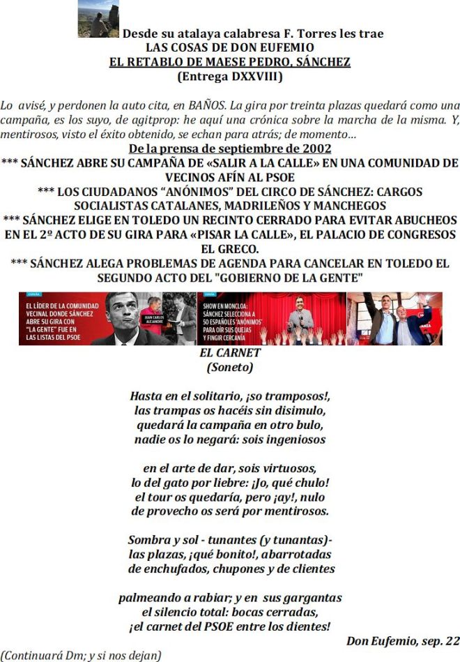 Buenos días, mi Coronel, don Eufemio y todos. Ninguno de todos estos protagonistas de sus sonetos disimula lo que son, y ellos lo saben, con lo que estos actos de autopromoción son pura chulería. En cuanto al alarmófobo Pablo es como Makie el Navaje el de la cancíon, que al final la espichó acompañado del musical sonido de un treinta y ocho especial, y no al son estridente de una alarma anti-chorizos. Aún entre podemitas, todavía hay clases; o al menos ellos mismos eso dicen.