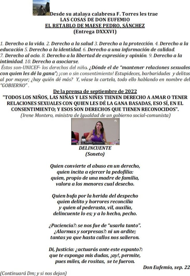 Y ahora resulta que los pederastas y corruptores de menores no son aquellos individuos, e individuas, harapientos, de los años cuarenta y cincuenta, marginados sociales y siempre huyendo de la justicia, clasificados en una ley que se llamaba «de vagos y maleantes», ahora están en el sistema cobrando de los impuestos de todos y gozando de inmunidad jurídica, pervirtiendo a la infancia.