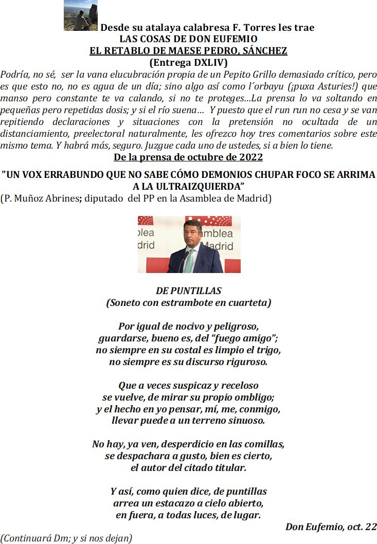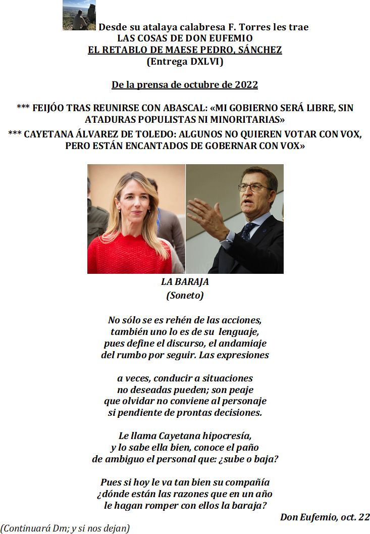 Tal como veo el panorama, y si usted lo aprueba, de lo que tengo mis dudas, votaré en Mayo y en Madrid a Isabel Días Ayuso, no porque tenga seguridad alguna sobre su gestión, que hasta ahora me ha parecido correcta con sus fallos, más bien por el personaje, que me hace gracia y es valiente y sigue una senda que en su momento me pareció adecuada, a su estilo, porque hay diferencias notables, claro está, con Esperanza Aguirre, que también decía las cosas claras y que a pesar de que han intentado involucrarla en toda clase de chapucerías, siempre sale airosa, por algo será con los fiscales que tenemos que ¿a quién pertenecen? pues eso.