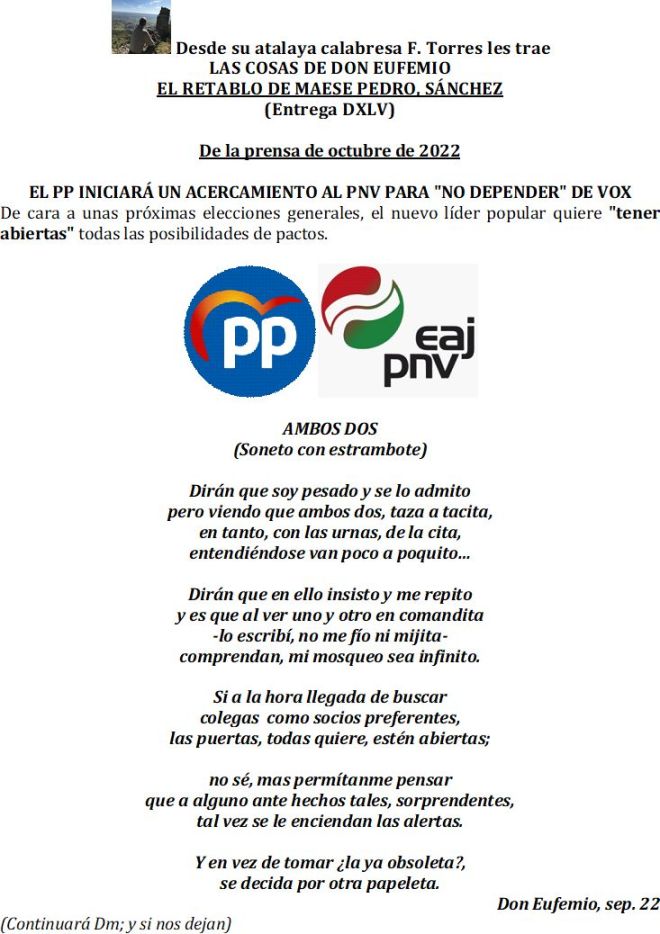 Siguen siendo los mismos. Temerosos, acomplejados, retraídos,etc. Inimaginable en un líder del PP decisiones,hasta ilegales, aprovechando el “largo me lo fiáis” de la Justicia. Decía aquel: “Que me quiten lo bailao “. Y para más Inti buscar refugio en el Vasco, traidor a su antecesor con puñalada por la espalda. Si, el famoso Aitor con su tractor. No escarmentamos nunca.