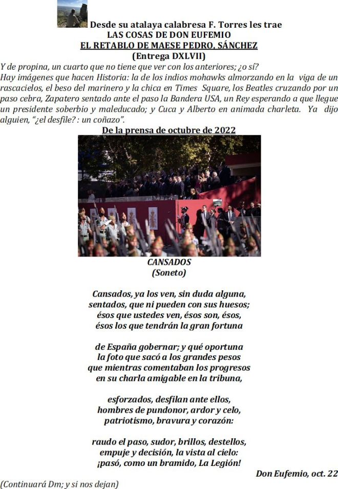 Ya se que tiendo a ser benévola a pesar de no fiarme, pero recuerdo muy bien que cuando podía asistir al desfile y pasaba la Legión, aparte de aplaudir como una desesperada, a veces comentaba con mis hijas sobre su forma de desfilar o lo mucho que que me gustaba y emocionaba esa velocidad que a uno le parece casi imposible de desplegar, ¿no podría ser esa la charleta de los personajes en cuestión? Que escogieran justo ese momento para hablar de otra cosa me parece casi inconcebible porque el paso de La Legión no es precisamente silencioso, y los aplausos no ayudan a hablar en voz baja. En fin, no quiero pasar por demasiado inocente, intento aplicar el sentido común a algo que me parece sumamente inusual, porque a nuestro siempre «recordado Rajoy» podría parecerle aburrido un desfile militar, pero aparte de su puro y sus wiskies no parecía que nada le divirtiera mucho. Y así nos fue.
